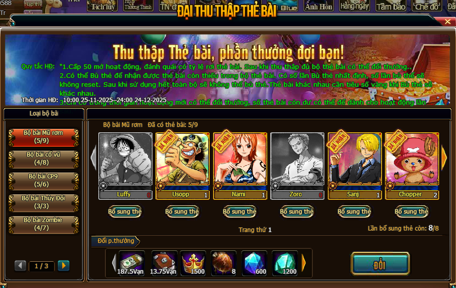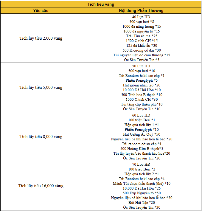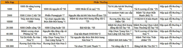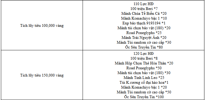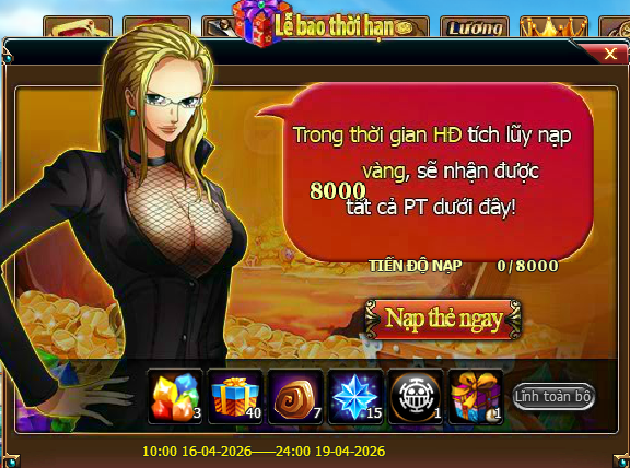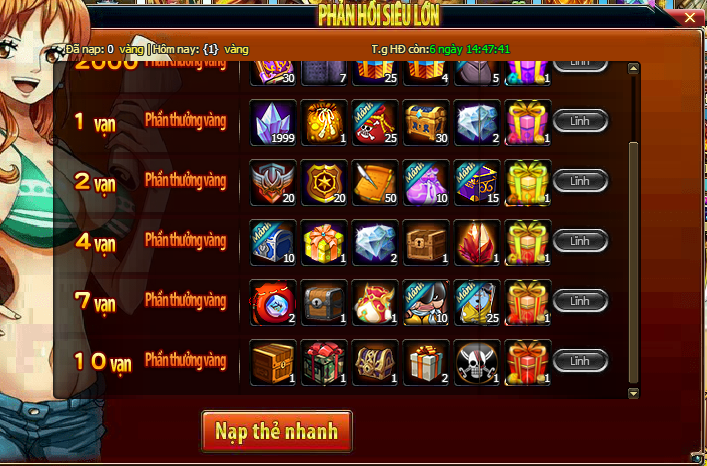 - Trong thời gian diễn ra hoạt độn g, mức nạp thẻ tích lũy của Thuyền Trưởng đạt 8 000 vàng thì có thể lĩnh toàn bộ phần thưởng trong giao diện hoạt động.