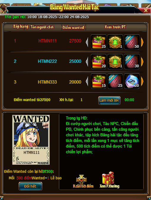 - Điểm Wanted tích lũy: dùng để thống kê xếp hạng của Thuyền Trưởng, sau khi hoạt động kết thúc căn cứ vào xếp hạng để phát thưởng
