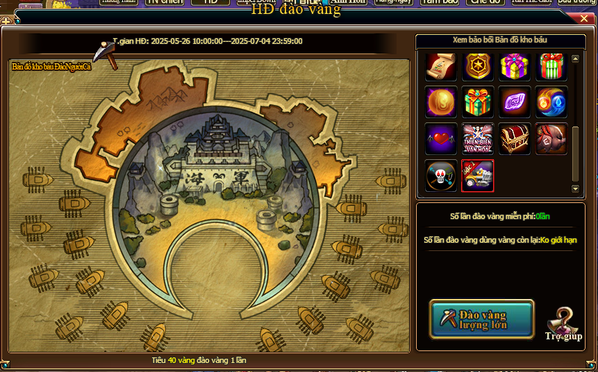 - Trong thời gian hoạt động, mỗi ngày có 3 lần đào vàng miễn phí, phí đào vàng 40 vàng/lần