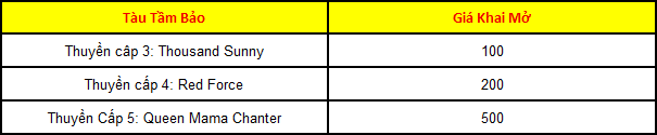 - Mỗi một tàu Tầm Bảo tương ứng với 1 phần thưởng khác nhau. Tàu càng về sau phần thưởng sẽ càng giá trị.