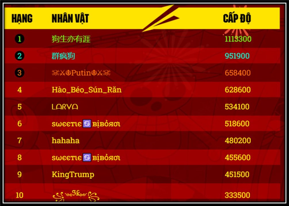 Vậy là sự kiện Tết Tung Xúc Xắc – Bung Lì Xì Khủng đã diễn ra vô cùng thành công. BQT xin công bố đến các Thuyền Trưởng bảng xếp hạng trao thưởng như sau.