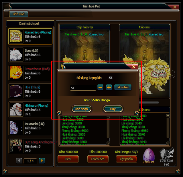 Tính năng sử dụng số lượng số lượng nhiều kibi dango để nâng cấp pet