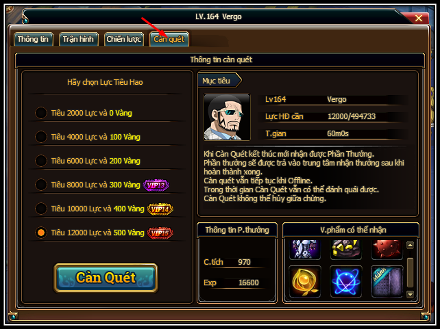 Nhấp vào quái trên bất kì map nào -> hiển thị bảng thông tin quái -> chọn "càn quét"