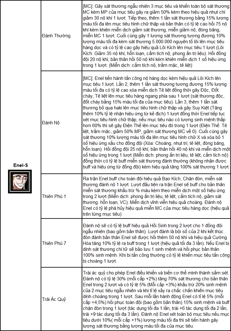 Như đã thông báo với các Thuyền Trưởng về lộ trình cập nhật tướng ở bảng tin trước đó. Enel sẽ là vị tướng tiếp theo cập bến (thông tin chi tiết tham khảo bên dưới).