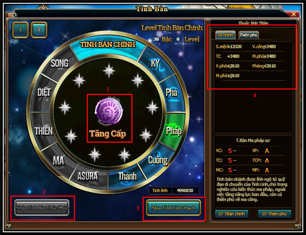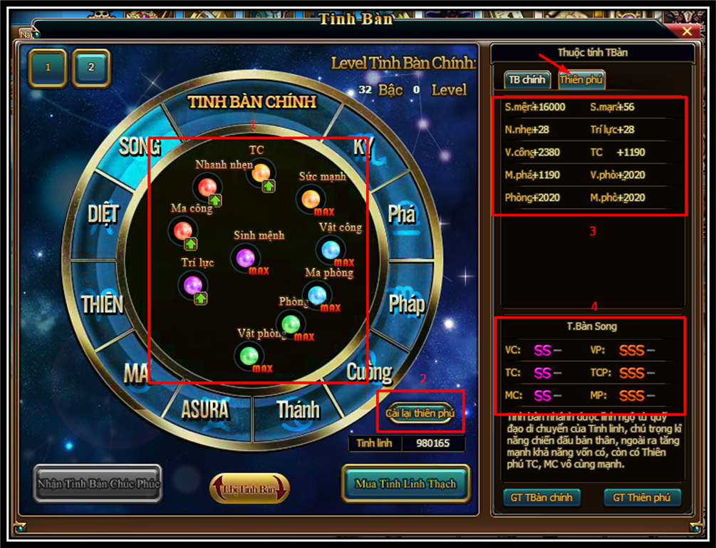 - Tất cả các chỉ số mà Thuyền Trưởng đã thăng cấp tinh bàn thiên phú sẽ được thống kê tại đây