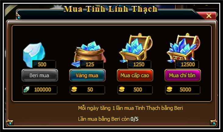 - Mỗi ngày có thể mua 1 lần bằng beri và không giới hạn số lần mua bằng vàng trong ngày